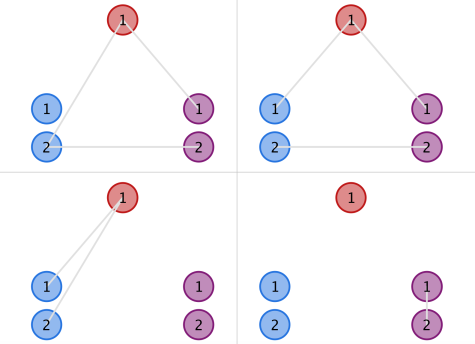 In the second example, the upper two structures in the figure below are instances of valid ones, while the lower two are invalid due to the blue and purple clusters, respectively.