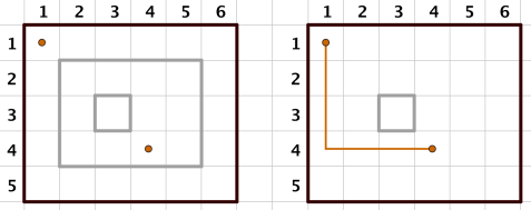有时 Koyomi 会尝试从某个格子走到另一个格子,且不能跨越障碍物,以免损坏地上的各种物品。" $3\ r_{1}\ c_{1}\ r_{2}\ c_{2}$ " 表示 Koyomi 试图从 $(r_{1},c_{1})$ 走到 $(r_{2},c_{2})$,且途中不能跨越障碍物。