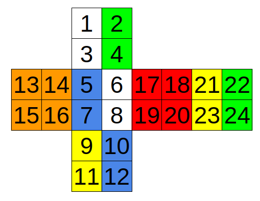 在第一个样例中,魔方如图所示: ![](https://cdn.luogu.com.cn/upload/vjudge_pic/CF887C/73004469d714c2206d92e2fac016d4fc092e2426.png) 在第二个样例中,魔方如图所示: ![](https://cdn.luogu.com.cn/upload/vjudge_pic/CF887C/37b512d2c715516faa04a8cfe0023b26918d7893.png) 可以通过将包含编号 13、14、15、16 的面旋转来还原魔方。 由 ChatGPT 5 翻译