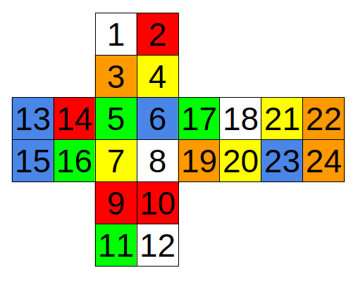 第一行给出由 24 个整数 $a_i$($1 \le a_i \le 6$)组成的序列,第 $i$ 个数代表第 $i$ 个小正方形的颜色。序列中每种颜色恰好出现 4 次。