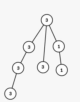 你需要用尽可能少的步数将树染成指定的颜色。每一步你可以选择一个结点 $v$ 和一种颜色 $x$,然后将 $v$ 的子树(包括 $v$ 本身)中的所有结点染成颜色 $x$。也就是说,对于每个从根到 $u$ 的路径经过 $v$ 的结点 $u$,都将其颜色 $c_u$ 设为 $x$。