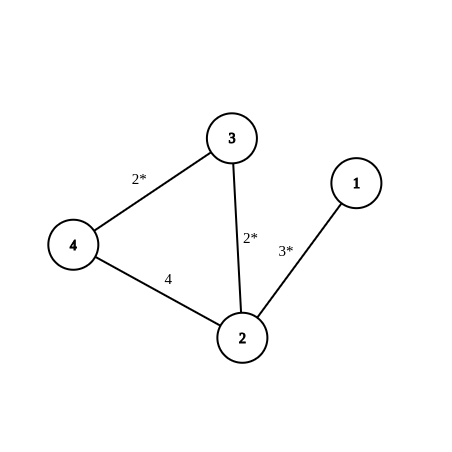 最短路径为序列:$ \{1,2,3,4\} $。有 * 号标记的边属于最小生成树。