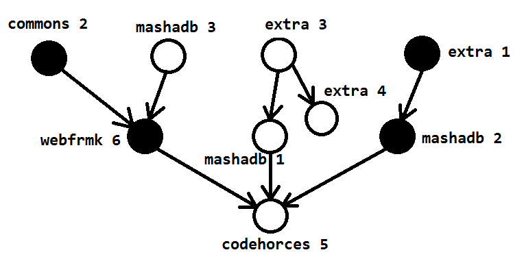 The second sample is again given in the pic below. Arrow from $ A $ to $ B $ means that $ B $ directly depends on $ A $ . Projects that Polycarp's project «codehorses» (version $ 5 $ ) depends on are paint it black. Note that «extra 1» is chosen instead of «extra 3» since «mashadb 1» and all of its dependencies are ignored due to «mashadb 2».