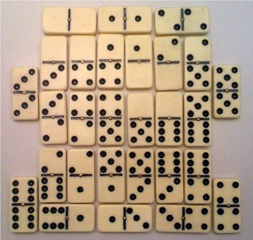 小 Gennady 在生日时收到了一个多米诺骨牌套装。这个套装包含 $28$ 个不同的尺寸为 $2×1$ 的多米诺骨牌。每个多米诺的两半分别写有 $0$ 到 $6$ 之间的一个数字。 `0-0 0-1 0-2 0-3 0-4 0-5 0-6