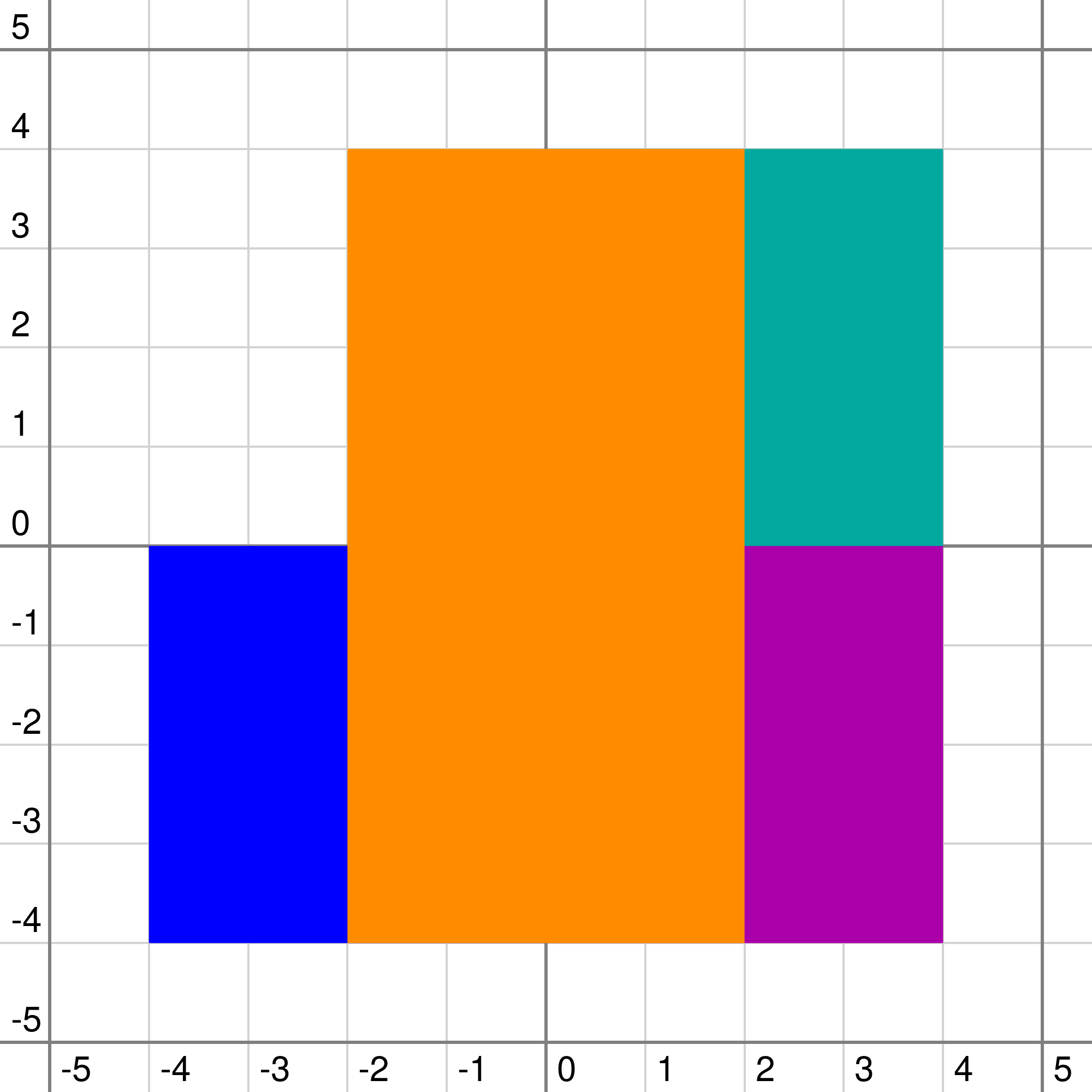 接下来的 $n$ 行中,第 $i$ 行包含 $4$ 个整数 $x_1$、$y_1$、$x_2$ 和 $y_2$($-10^9 \le x_1 < x_2 \le 10^9$,$-10^9 \le y_1 < y_2 \le 10^9$),表示第 $i$ 个矩形的左下角和右上角坐标。