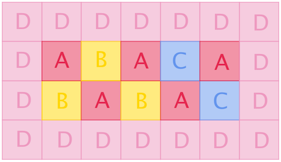 让你构造一个$n*m$矩阵,这个矩阵由4种字符填充构成,给定4个整数,即矩阵中每种字符构成的四联通块个数,$n,m$需要你自己定,但是不能超过50