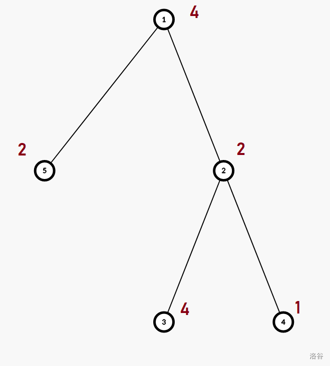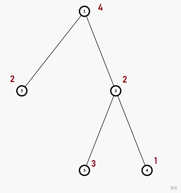 现在,顶点 $2$ 的子树中包含数字 $1, 2, 4$。