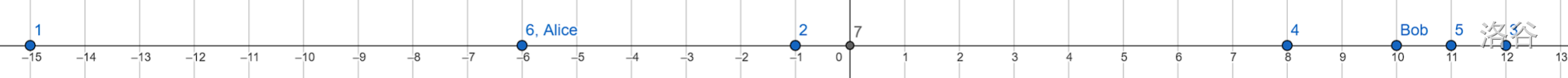 在第一个测试用例中:共有 $7$ 个城市。爱丽丝从坐标 $-6$ 出发,鲍勃从点 $10$ 出发。