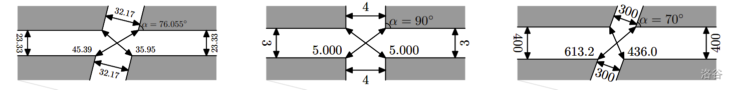 在阅读某场比赛中又一个无聊问题的题面时——这场比赛被某些人称为极其重要——你陷入了对故乡别洛达尔(Berlodar)的怀念与遐想。你回忆起自己是多么喜欢沿着它的两条主要道路漫步:福尔摩斯大道(Holmes Avenue)和华生街(Watson Street),这两条路将城市划分为四个巨大的区域。你微微笑了起来,回想起五年级一堂久远的数学课后,当老师讲到角度和距离时,你的眼睛亮了起来,随后的整个晚上,你都在城市的主要交叉口来回走动,最终测出福尔摩斯大道的宽度为 $\ell_H$ 米,华生街的宽度为 $\ell_W$ 米,并且它们相交的角度为 $\alpha$ 度。你在家里翻出一张城市地图,欣慰地确认了你的测量结果是正确的。