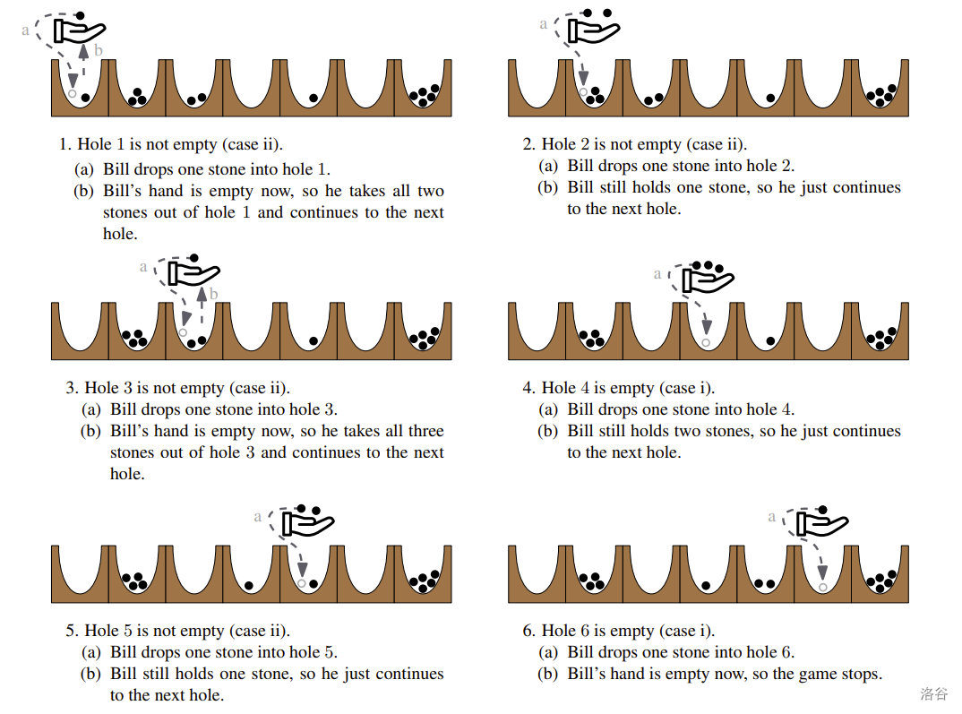 1. 如果洞是空的,他将一颗石子放入其中。然后他检查手里还剩多少颗石子。如果手里空了,游戏停止。否则,他将手移动到下一个洞 $i+1$ 并重复这些步骤。