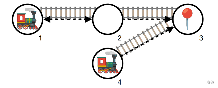 图 H.1:第三个样例的可视化。汉娜从车站 4 出发,你从车站 1 出发。你们俩都可以到达车站 3 见面。