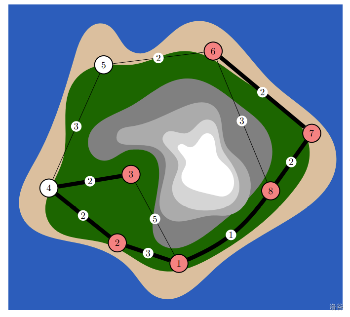 有一条环绕火山的主要环形自行车道。沿途它恰好经过岛上的每个村庄一次。每个村庄可能还有额外的自行车道。为了通过新道路连接所有目的地,GCPC 至少需要花费多少来替换自行车道?