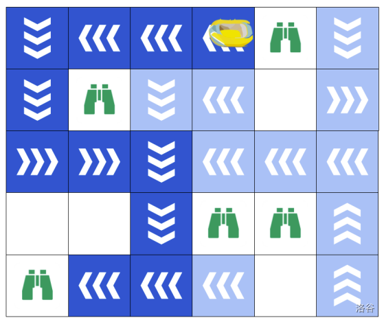 第一个样例的示意图。最优漂流从画有筏子的格子出发,共游览 4 个观光景点(用望远镜标记)。沿途到达的河流格子用深蓝色高亮显示。