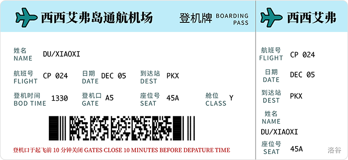 西西艾弗岛景色优美,游人如织。但是,由于和外界的交通只能靠渡船,交通的不便严重制约了岛上旅游业的发展。 西西艾弗岛管委会经过努力,争取到了一笔投资,建设了一个通用航空机场。在三年紧锣密鼓的主体建设后, 西西艾弗岛通用航空机场终于开始进行航站楼内部软硬件系统的安装和调试工程了。小 C 是机场运营公司信息部的研发工程师, 最近,信息部门的一项重要任务是,研发登机牌自助打印系统。如图所示的是设计部门根据国际民航组织的行业标准设计的登机牌样张。