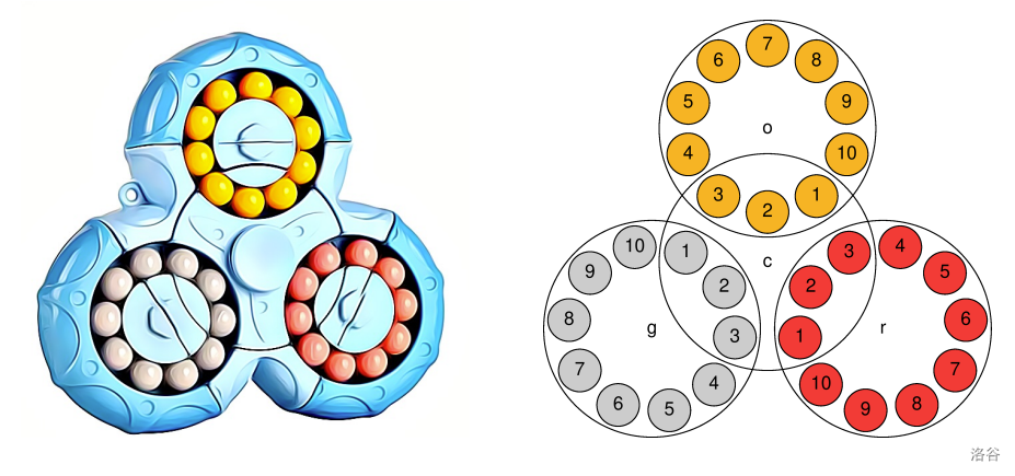 输入包含恰好三行。每行是一个长度为十的字符串,仅由字符 `o`、`g` 和 `r` 组成。第一行描述上方圆环中的十个珠子,第二行描述左下方圆环中的珠子,第三行描述右下方圆环中的珠子。 字符 `o` 表示橙色珠子,`g` 表示灰色珠子,`r` 表示红色珠子。珠子按顺时针顺序列出,编号与图中一致。 输入配置是通过对复原状态应用至多 $ 240 $ 步操作后得到的结果。