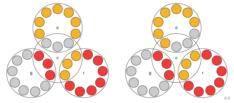 输出第一行一个整数 $ k $($ 0 \le k \le 240 $),表示你解决该谜题所需的步数。 如果 $ k > 0 $,接下来输出 $ k $ 行,每行一个操作,按顺序列出。每个操作由一个字符表示旋转哪个圆环,紧接着一个数字表示顺时针旋转的步数。上方圆环用 `o` 表示,左下方圆环用 `g` 表示,右下方圆环用 `r` 表示,中间圆环用 `c` 表示。对于前三个圆环,旋转步数为 $ 1 $ 到 $ 9 $;对于中间圆环,旋转步数为 $ 1 $ 到 $ 2 $。 下面的两张图片展示了两个样例的输入状态。 :::align{center} ![](https://cdn.luogu.com.cn/upload/image_hosting/eqh3r6u7.png) :::