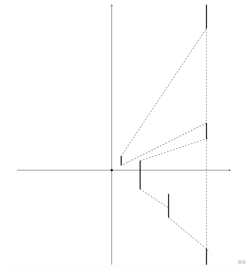 你在二维平面的原点处有一个点光源。右侧有一堵无限高的墙。在光源和墙壁之间有一些不透明的垂直线段。因此,每条线段都会在墙上投射出一个阴影。所有这些阴影重叠后,在墙上形成一个或多个区间。