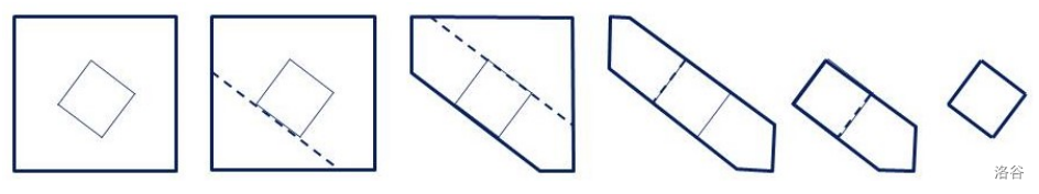你想要通过一系列切割将 $B$ 从 $A$ 中分离出来。为此,每次你画一条完全穿过 $A$ 的直线,该直线经过 $B$ 的一条边,并将 $A$ 分成两部分。你沿着这条直线切割,并丢弃不包含 $B$ 的那一部分。重复这一过程,直到剩余的部分恰好就是 $B$。