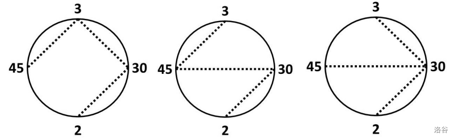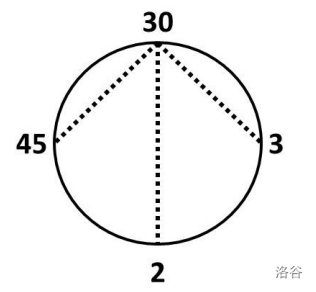 假设霍尔女士有四个学生,她给他们分配的数字是 $2$、$3$、$30$ 和 $45$。在这种安排下,只有一种方式拉伸彩带: