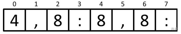 在这个例子中,有两组匹配的括号:外括号和内括号。外括号出现在内括号之前,因为起始括号先出现。因此,外括号的头部会出现在内括号的头部之前。头部 $4,8:$ 表示外括号,而头部 $8,8:$ 表示内括号。从第 4 个字符到第 7 个字符的子串是 $8,8:$,它表示外括号内部包含的内容。注意,$5,11:11,11:$ 也可能是合法的替代表示法,但我们希望得到最短的表示法,这就是为什么 $4,8:8,8:$ 是正确的答案。