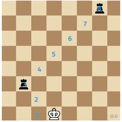 一个可行的方案如图所示,其中蓝色数字表示王在对应步数所在的位置。
