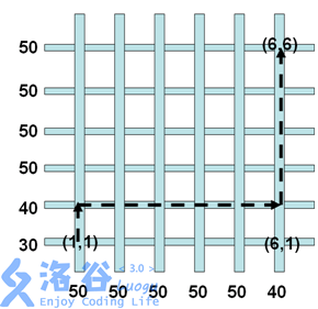 有n条南北方向的双向街道和n条东西方向的双向街道纵横交错。相邻街道(不管是哪个走向)的距离均为L英里。西南角交叉口的坐标为$(1,1)$,东北角为$(n,n)$。在所有交叉口均可任意改变行驶方向。每条街道有它自己的最高速度限制,该限制对整条街道有效(不管行驶方向如何)。