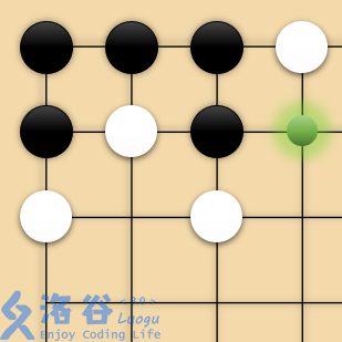 * 如果黑棋走 $(3, 2)$,如图,此时白棋唯一可走的点是 $(2, 3)$,之后黑棋无棋可走;
