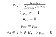 As Elizabeth’s “best friend”, Dickie knows her preferences and tastes. He knows that if she’s at a given position x, she will move to any adjacent position y with a probability pxy depending on the joy attained going there and the amount of snow on the path. The joy jxy is being measured in joysons and the snow sxy by centimeters, and the choice will be taken by the relation jxy /sxy . Some properties shall hold:
