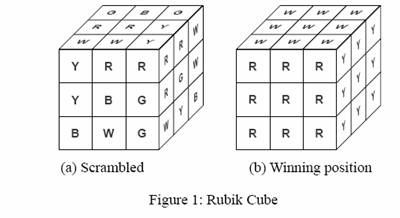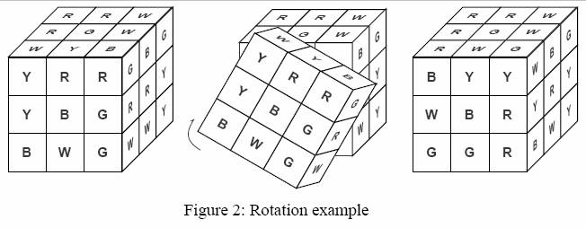 当你旋转魔方的一面时,所有与之相邻面的颜色排列同时会发生变化。图 2 展示了某一面的旋转过程。对于一个随机打乱的魔方配置,要想复原到最终状态并非易事,这一点你可能很清楚。