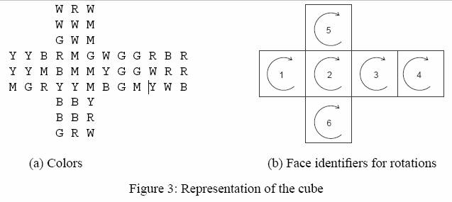 不过,你的爷爷具有丰富的经验,他声称无论面临什么样的魔方配置,他总能找出一系列旋转操作,使魔方达到胜利状态。为了方便观察魔方的每一个面,我们将它平铺展开成如图 3a 那样的形式。魔方的六种颜色是黄色、红色、蓝色、绿色、白色和洋红色(分别用首字母表示)。