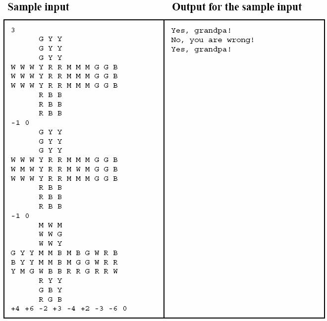 对于每组测试数据,你的程序应输出一行。如果爷爷的说法正确,输出 `Yes, grandpa!`,否则输出 `No, you are wrong!`。(参考示例)