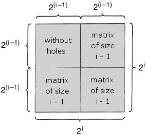 画室正在准备大量生产画作,采用的是不同大小的方阵。一个大小为 $i$ 的方阵有 $2^i$ 行和 $2^i$ 列。在某些行和列的交点上会有孔洞。对于大小为 0 的方阵,就是一个含有一个孔洞的点阵。而对于 $i > 0$,大小为 $i$ 的方阵由四个 $2^{(i-1)} \times 2^{(i-1)}$ 的小方阵组成。请参考下图: