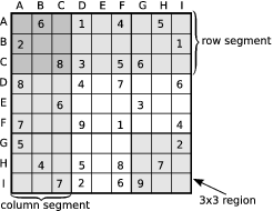 The sudoku board consists of 9×9 cells. These can be grouped into 3×3 _regions_ of 3×3 cells each. Some of the cells are filled with a digit 1 through 9 while the rest of them are left empty. The aim of the game is to fill each empty cell with a digit 1...9 so that every row, every column and every region contains each of the numbers 1...9 exactly once. A proper sudoku puzzle always has exactly one solution.