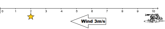 The cannon ball move at speed 2 m/s relative to the wind, so if it shoot to the right, because of the wind blowing 3 m/s to the left relative to the ground, the cannon ball move (3-2=1) m/s to the left relative to the ground and will eventually hit the target in 8 seconds, but this is not optimal, it's faster to shoot the cannon ball to the left, because the wind blowing 3 m/s to the left relative to the ground (and the same direction as the cannon ball move relative to the wind), so the cannon ball will move (3+2=5) m/s to the left relative to the ground and will eventually hit the target at (10-2)/5 = 8/5 = 1.6 seconds. We need to print the result rounded to 6 digit after decimal places, so the minimum time needed for the cannon ball to reach the target is 1.600000 seconds.