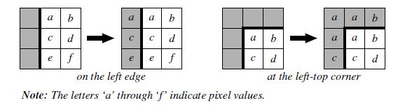 由于图像边缘缺少相邻像素,边缘部分需要特别处理。在本题中,我们通过重复图像边缘的像素值来扩展图像,如下图所示。也就是说,缺失的像素将采用原图中最近的像素值。