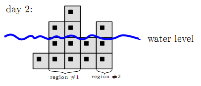 在一个海滨小镇,有一条摩天大楼大道。这些摩天大楼每栋宽 100 米,高度各不相同。由于地价奇高,任何两栋相邻的摩天大楼都是紧挨着的。这条大道紧靠海滩,街道正好处于海平面上方。不幸的是,由于全球变暖,今年海平面每天上升 1 米。如果某栋摩天大楼的高度不高于当前的海平面,则这栋楼被认定为已被淹没。一个区域是指由相邻的、未被淹没的摩天大楼组成的最大连续部分。这个概念非常重要,因为我们只需向每个区域的任意一栋楼输送物资(如水、电或者日常用品)即可满足所有楼的需求。因此,市长希望了解即将到来的艰难日子里,一共有多少这样的区域。下图展示了一个有 5 栋摩天大楼的大道在第 2 天的状态: