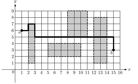 MegaCity of the future is a rectangular grid of streets. Each intersection has integer Cartesian coordinates x and y. To get from intersection a with coordinates x $ _{a} $ , y $ _{a} $ to intersection b with coordinates x $ _{b} $ , y $ _{b} $ you need to drive exactly | x $ _{a} $ - x $ _{b} $ | + | y $ _{a} $ - y $ _{b} $ | blocks. Usually, it takes 10 time units to drive one block, so one can easily compute the time it takes to get from a to b. However, traffic jams that occur in MegaCity turn estimation of minimal driving time into a complex problem that you have to solve.