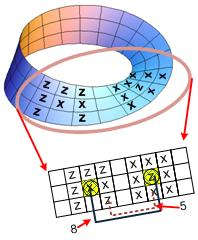 One clearance of a pair of squares containing x and z could be executed only if there is a direct path between two squares through consecutive 4 neighboring empty squares with at most two left or right turns. The intermediate empty squares may locate out of the Moebius. The cost to clear a pair of squares containing x and z is the length of the shortest direct path between two squares. After a clearance, the two original squares containing x and z become empty. The figure above shows two consecutive clearances with the cost of 5 and 8 respectively.