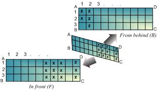 A Moebius is made from a rectangular M×N paper, namely ABCD. Each face of this paper consists of a rectangular grid of equivalent squares 1×1 . On both grids, columns are sequentially numbered from 1 to N and rows are sequentially numbered from 1 to M, all starting at A corner. In addition, every square (i, j), located at row i and column j, can contain x, z or nothing (empty square). Taking this paper and giving it a half-twist, then joining the ends together, A with C and B with D, to form a single band, we have a Moebius, which has only one surface, for this game.