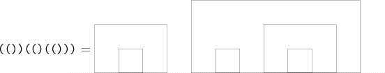 这种表示法的正式定义如下:最简单的正确括号序列 $()$ 可以被形象化为一个 $1 \times 1$ 的正方形。若 $A$ 是一个正确的括号序列,且 $g(A)$ 是其表示,则 $(A)$ 的表示是一个矩形,该矩形将 $g(A)$ 包围,宽比 $g(A)$ 多两单位,高度比 $g(A)$ 的最高点多一单位。而当 $A$ 和 $B$ 是两个正确的括号序列,并且 $g(A)$ 和 $g(B)$ 是它们各自的表示时,可以通过将 $g(B)$ 放在 $g(A)$ 的右边一单位位置来得到 $g(AB)$ 的表示。