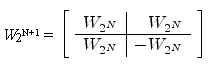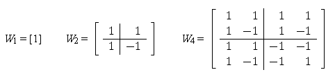 A Walsh Matrix of size 2^(N+1) can be constructed as the "union" of 4 Walsh Matrices of size 2^N arranged such that the lower right matrix is inverted whereas the other 3 matrices are not, i.e.: