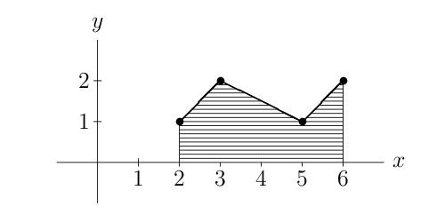在 XY 平面上,有一组点的 x 坐标各不相同,这些点构成了一条多段线。我们通过对这些点按 x 坐标进行递增排序,并将各个点顺次相连来定义这条多段线。该多段线的积分即是在 x 轴和这条线之间的区域面积,范围从第一个 x 值到最后一个 x 值。举例来说,点集 {(5, 1), (3, 2), (6, 2), (2, 1)} 定义了一条多段线;这条多段线的积分值是阴影区域的面积,为 6。