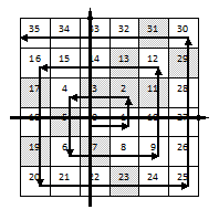 There is a very large field, colored white and divided into squares. There is a coordinate system attached to the field: y-axis goes from south to north and x-axis goes from west to east. Sides of the squares are parallel to the axes. There is a robot in the (0, 0) square. Robot starts to move in spiral as depicted. First it moves one step east and one step north. Then two steps west and two steps south. Then three steps east and three steps north, four steps west and four steps south and so on. It moves to a new square with each step. As it moves it counts squares it passes and, if the number of the square is the prime number, then the robot fills this square with black color. The (0, 0) square has the number 0. Given the coordinates of a square you are to calculate the distance from this square to the nearest to it black square. For two squares with coordinates (x1, y1) and (x2, y2) the distance between those squares is |x1-x2|+|y1-y2|.