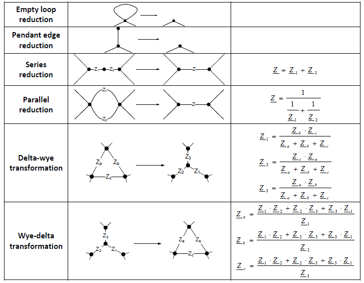 证明表明,任何线性和平面图(可以绘制得使其边仅在端点相交)都可以通过以下六种变换简化成一条单一等效边,从而得到其节点间的等效阻抗: