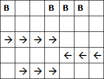 在一个坐标平面上,有 $N$ 条水平传送带,每条传送带要么向左移动,要么向右移动。当一个球落到传送带上时,传送带将球沿着它的运动方向带动。球到达传送带末端时,会垂直向下掉落。例如,如果传送带向右移动并在 $x$ 坐标为 12 的地方结束,球会在 $x$ 坐标为 13 的地方掉下来,并在该处垂直下落,直到落到另一条传送带上或者到达地面(高度为 0)。
