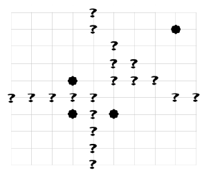 例如,如果蚂蚁镇有 10 条水平街道和 10 条垂直街道,并且有 4 个交叉口放置了雨伞,那么图中标出的问号代表了「湿交叉口」: