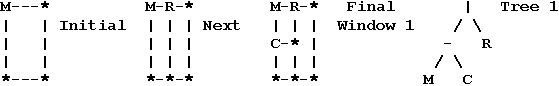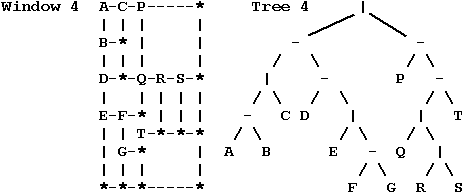 2. A window may either be split into left and right subwindows or into top and bottom subwindows, and the corresponding trees have as root the boundary character for the split: a vertical line '|' or a horizontal dash '-' respectively. The root has left and right subtrees corresponding to the top and bottom or left and right subwindows respectively.