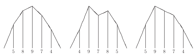 以下图示展示了三种符合上述要求的画布布置方法,杆子的高度依次为 4、5、7、8 和 9。