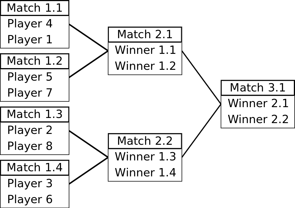 为了让比赛尽可能长,协会希望最大化比赛的电视转播时长,因为他们能从中获得丰厚的收益。协会对于任意一对不同选手都了解其中一人战胜另一人的概率。作为组织委员会的一员,你需要设计每一轮的比赛安排,以最大化整场比赛的期望局数。这包括决定第一轮的选手配对,以及之后每一轮中如何从前一轮中挑选比赛胜者配对进行比赛。请注意,配对只能根据上一轮胜者的标识来决定。下图展现了 **K** = 3 轮和 **N** = 8 名选手的一种可能的比赛安排。