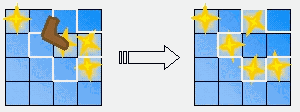 If the dancer steps on the tile indicated by the brown shoe, all the tiles within the white area change their states. The resulting dance floor is depicted on the right.
